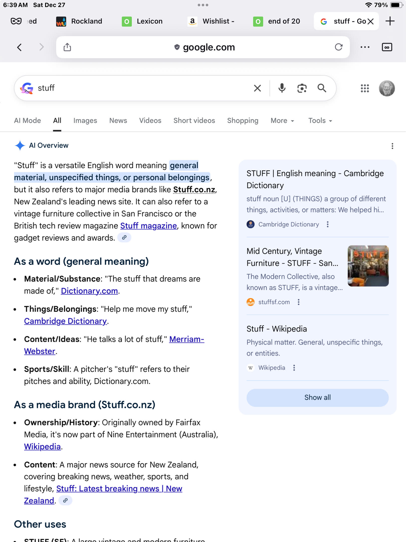 If I ask the google for 'stuff', here's what the first page of results looks like 27xii25: